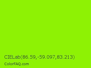 CIELab 86.59,-59.097,83.213 Color is a normal green color and the nearest color is Chartreuse #7fff00. Hex code #8df203 and RGB value is rgb(141,242,3). In RGB color space, this color is composed of 55% red, 95% green, 1% blue, In CMYK color space, this color is composed of 42% cyan, 0% magenta, 99% yellow , 5% black , In HSL color space, this color has a hue angle of 85° , 98% saturation and 48% lightness.