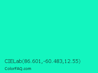 CIELab 86.601,-60.483,12.55 Color is a normal cyan color and the nearest color is Bright Turquoise #08e8de. Hex code #12f5bf and RGB value is rgb(18,245,191). In RGB color space, this color is composed of 7% red, 96% green, 75% blue, In CMYK color space, this color is composed of 93% cyan, 0% magenta, 22% yellow , 4% black , In HSL color space, this color has a hue angle of 166° , 92% saturation and 52% lightness.