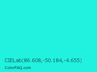 CIELab 86.608,-50.184,-4.655 Color is a normal cyan color and the nearest color is Bright Turquoise #08e8de. Hex code #21f2e0 and RGB value is rgb(33,242,224). In RGB color space, this color is composed of 13% red, 95% green, 88% blue, In CMYK color space, this color is composed of 86% cyan, 0% magenta, 7% yellow , 5% black , In HSL color space, this color has a hue angle of 175° , 89% saturation and 54% lightness.