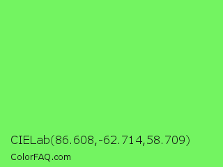 CIELab 86.608,-62.714,58.709 Color is a light green color and the nearest color is Screamin Green #66ff66. Hex code #73f461 and RGB value is rgb(115,244,97). In RGB color space, this color is composed of 45% red, 96% green, 38% blue, In CMYK color space, this color is composed of 53% cyan, 0% magenta, 60% yellow , 4% black , In HSL color space, this color has a hue angle of 113° , 87% saturation and 67% lightness.