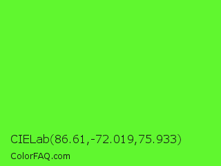 CIELab 86.61,-72.019,75.933 Color is a normal green color and the nearest color is Spring Frost #87ff2a. Hex code #60f72f and RGB value is rgb(96,247,47). In RGB color space, this color is composed of 38% red, 97% green, 18% blue, In CMYK color space, this color is composed of 61% cyan, 0% magenta, 81% yellow , 3% black , In HSL color space, this color has a hue angle of 105° , 93% saturation and 58% lightness.