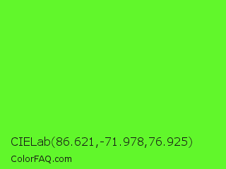 CIELab 86.621,-71.978,76.925 Color is a normal green color and the nearest color is Spring Frost #87ff2a. Hex code #61f72b and RGB value is rgb(97,247,43). In RGB color space, this color is composed of 38% red, 97% green, 17% blue, In CMYK color space, this color is composed of 61% cyan, 0% magenta, 83% yellow , 3% black , In HSL color space, this color has a hue angle of 104° , 93% saturation and 57% lightness.