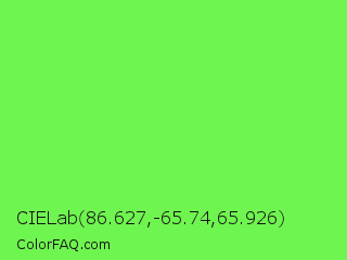 CIELab 86.627,-65.74,65.926 Color is a light green color and the nearest color is Screamin Green #66ff66. Hex code #6ff54f and RGB value is rgb(111,245,79). In RGB color space, this color is composed of 44% red, 96% green, 31% blue, In CMYK color space, this color is composed of 55% cyan, 0% magenta, 68% yellow , 4% black , In HSL color space, this color has a hue angle of 108° , 89% saturation and 64% lightness.