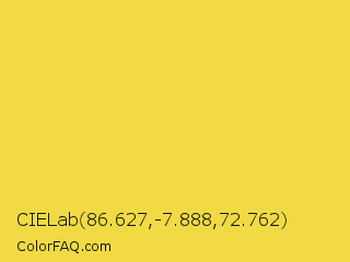 CIELab 86.627,-7.888,72.762 Color is a normal yellow color and the nearest color is Sandstorm #ecd540. Hex code #f1da43 and RGB value is rgb(241,218,67). In RGB color space, this color is composed of 95% red, 85% green, 26% blue, In CMYK color space, this color is composed of 0% cyan, 10% magenta, 72% yellow , 5% black , In HSL color space, this color has a hue angle of 52° , 86% saturation and 60% lightness.