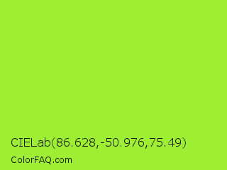CIELab 86.628,-50.976,75.49 Color is a normal green color and the nearest color is Green Lizard #a7f432. Hex code #9eef34 and RGB value is rgb(158,239,52). In RGB color space, this color is composed of 62% red, 94% green, 20% blue, In CMYK color space, this color is composed of 34% cyan, 0% magenta, 78% yellow , 6% black , In HSL color space, this color has a hue angle of 86° , 85% saturation and 57% lightness.
