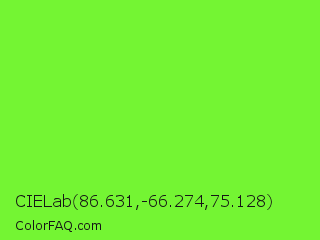 CIELab 86.631,-66.274,75.128 Color is a normal green color and the nearest color is Spring Frost #87ff2a. Hex code #74f533 and RGB value is rgb(116,245,51). In RGB color space, this color is composed of 45% red, 96% green, 20% blue, In CMYK color space, this color is composed of 53% cyan, 0% magenta, 79% yellow , 4% black , In HSL color space, this color has a hue angle of 100° , 91% saturation and 58% lightness.