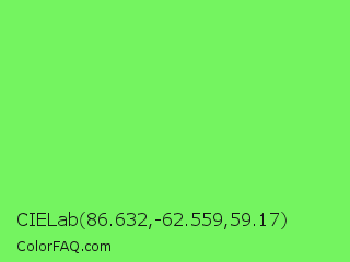 CIELab 86.632,-62.559,59.17 Color is a light green color and the nearest color is Screamin Green #66ff66. Hex code #74f460 and RGB value is rgb(116,244,96). In RGB color space, this color is composed of 45% red, 96% green, 38% blue, In CMYK color space, this color is composed of 52% cyan, 0% magenta, 61% yellow , 4% black , In HSL color space, this color has a hue angle of 112° , 87% saturation and 67% lightness.