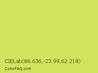 CIELab 86.636,-23.99,62.218 Color is a light yellow color and the nearest color is Maximum Green Yellow #d9e650. Hex code #d1e35c and RGB value is rgb(209,227,92). In RGB color space, this color is composed of 82% red, 89% green, 36% blue, In CMYK color space, this color is composed of 8% cyan, 0% magenta, 59% yellow , 11% black , In HSL color space, this color has a hue angle of 68° , 71% saturation and 63% lightness.