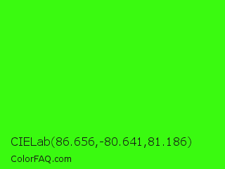 CIELab 86.656,-80.641,81.186 Color is a normal green color and the nearest color is Neon Green #39ff14. Hex code #3afa10 and RGB value is rgb(58,250,16). In RGB color space, this color is composed of 23% red, 98% green, 6% blue, In CMYK color space, this color is composed of 77% cyan, 0% magenta, 94% yellow , 2% black , In HSL color space, this color has a hue angle of 109° , 96% saturation and 52% lightness.