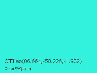 CIELab 86.664,-50.226,-1.932 Color is a normal cyan color and the nearest color is Turquoise #40e0d0. Hex code #33f2db and RGB value is rgb(51,242,219). In RGB color space, this color is composed of 20% red, 95% green, 86% blue, In CMYK color space, this color is composed of 79% cyan, 0% magenta, 10% yellow , 5% black , In HSL color space, this color has a hue angle of 173° , 88% saturation and 57% lightness.
