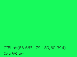CIELab 86.665,-79.189,60.394 Color is a normal green color and the nearest color is Malachite #0bda51. Hex code #17fa5c and RGB value is rgb(23,250,92). In RGB color space, this color is composed of 9% red, 98% green, 36% blue, In CMYK color space, this color is composed of 91% cyan, 0% magenta, 63% yellow , 2% black , In HSL color space, this color has a hue angle of 138° , 96% saturation and 54% lightness.