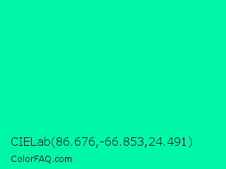 CIELab 86.676,-66.853,24.491 Color is a normal green color and the nearest color is Medium Spring Green #00fa9a. Hex code #00f7a8 and RGB value is rgb(0,247,168). In RGB color space, this color is composed of 0% red, 97% green, 66% blue, In CMYK color space, this color is composed of 100% cyan, 0% magenta, 32% yellow , 3% black , In HSL color space, this color has a hue angle of 161° , 100% saturation and 48% lightness.