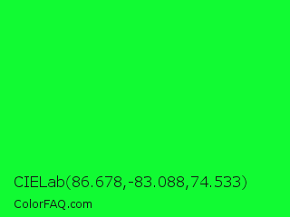 CIELab 86.678,-83.088,74.533 Color is a normal green color and the nearest color is Malachite #0bda51. Hex code #11fb33 and RGB value is rgb(17,251,51). In RGB color space, this color is composed of 7% red, 98% green, 20% blue, In CMYK color space, this color is composed of 93% cyan, 0% magenta, 80% yellow , 2% black , In HSL color space, this color has a hue angle of 129° , 97% saturation and 53% lightness.
