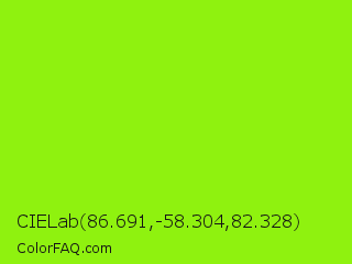 CIELab 86.691,-58.304,82.328 Color is a normal green color and the nearest color is Chartreuse #7fff00. Hex code #8ff20f and RGB value is rgb(143,242,15). In RGB color space, this color is composed of 56% red, 95% green, 6% blue, In CMYK color space, this color is composed of 41% cyan, 0% magenta, 94% yellow , 5% black , In HSL color space, this color has a hue angle of 86° , 90% saturation and 50% lightness.