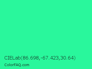 CIELab 86.698,-67.423,30.64 Color is a normal green color and the nearest color is Medium Spring Green #00fa9a. Hex code #29f79c and RGB value is rgb(41,247,156). In RGB color space, this color is composed of 16% red, 97% green, 61% blue, In CMYK color space, this color is composed of 83% cyan, 0% magenta, 37% yellow , 3% black , In HSL color space, this color has a hue angle of 153° , 93% saturation and 56% lightness.