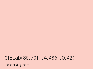 CIELab 86.701,14.486,10.42 Color is a very light red color and the nearest color is Your Pink #ffc3c0. Hex code #fccfc6 and RGB value is rgb(252,207,198). In RGB color space, this color is composed of 99% red, 81% green, 78% blue, In CMYK color space, this color is composed of 0% cyan, 18% magenta, 21% yellow , 1% black , In HSL color space, this color has a hue angle of 10° , 90% saturation and 88% lightness.