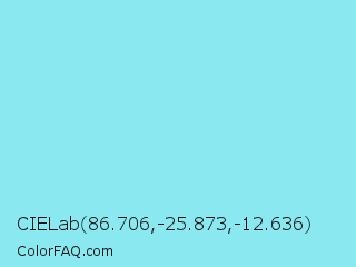 CIELab 86.706,-25.873,-12.636 Color is a light cyan color and the nearest color is Medium Sky Blue #80daeb. Hex code #8ae8f0 and RGB value is rgb(138,232,240). In RGB color space, this color is composed of 54% red, 91% green, 94% blue, In CMYK color space, this color is composed of 43% cyan, 3% magenta, 0% yellow , 6% black , In HSL color space, this color has a hue angle of 185° , 77% saturation and 74% lightness.