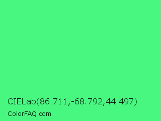 CIELab 86.711,-68.792,44.497 Color is a light green color and the nearest color is Very Light Malachite Green #64e986. Hex code #47f780 and RGB value is rgb(71,247,128). In RGB color space, this color is composed of 28% red, 97% green, 50% blue, In CMYK color space, this color is composed of 71% cyan, 0% magenta, 48% yellow , 3% black , In HSL color space, this color has a hue angle of 139° , 92% saturation and 62% lightness.