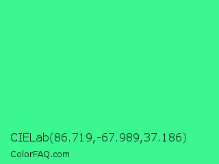 CIELab 86.719,-67.989,37.186 Color is a normal green color and the nearest color is Eucalyptus #44d7a8. Hex code #3bf78f and RGB value is rgb(59,247,143). In RGB color space, this color is composed of 23% red, 97% green, 56% blue, In CMYK color space, this color is composed of 76% cyan, 0% magenta, 42% yellow , 3% black , In HSL color space, this color has a hue angle of 147° , 92% saturation and 60% lightness.