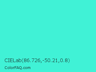 CIELab 86.726,-50.21,0.8 Color is a normal cyan color and the nearest color is Turquoise #40e0d0. Hex code #40f2d6 and RGB value is rgb(64,242,214). In RGB color space, this color is composed of 25% red, 95% green, 84% blue, In CMYK color space, this color is composed of 74% cyan, 0% magenta, 12% yellow , 5% black , In HSL color space, this color has a hue angle of 171° , 87% saturation and 60% lightness.