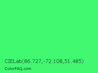 CIELab 86.727,-72.108,51.485 Color is a light green color and the nearest color is Screamin Green #66ff66. Hex code #41f871 and RGB value is rgb(65,248,113). In RGB color space, this color is composed of 25% red, 97% green, 44% blue, In CMYK color space, this color is composed of 74% cyan, 0% magenta, 54% yellow , 3% black , In HSL color space, this color has a hue angle of 136° , 93% saturation and 61% lightness.