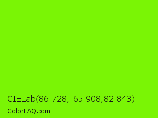CIELab 86.728,-65.908,82.843 Color is a normal green color and the nearest color is Lawn Green #7cfc00. Hex code #7af505 and RGB value is rgb(122,245,5). In RGB color space, this color is composed of 48% red, 96% green, 2% blue, In CMYK color space, this color is composed of 50% cyan, 0% magenta, 98% yellow , 4% black , In HSL color space, this color has a hue angle of 91° , 96% saturation and 49% lightness.