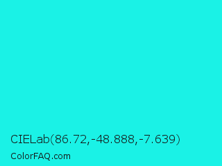 CIELab 86.72,-48.888,-7.639 Color is a normal cyan color and the nearest color is Bright Turquoise #08e8de. Hex code #1af2e6 and RGB value is rgb(26,242,230). In RGB color space, this color is composed of 10% red, 95% green, 90% blue, In CMYK color space, this color is composed of 89% cyan, 0% magenta, 5% yellow , 5% black , In HSL color space, this color has a hue angle of 177° , 89% saturation and 53% lightness.