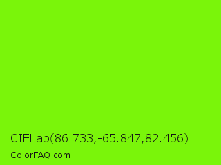 CIELab 86.733,-65.847,82.456 Color is a normal green color and the nearest color is Lawn Green #7cfc00. Hex code #7af50a and RGB value is rgb(122,245,10). In RGB color space, this color is composed of 48% red, 96% green, 4% blue, In CMYK color space, this color is composed of 50% cyan, 0% magenta, 96% yellow , 4% black , In HSL color space, this color has a hue angle of 91° , 92% saturation and 50% lightness.
