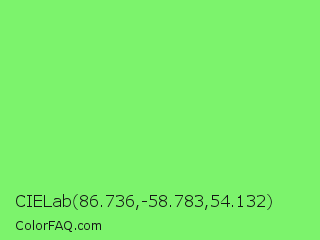 CIELab 86.736,-58.783,54.132 Color is a light green color and the nearest color is Pastel Green #77dd77. Hex code #7cf36c and RGB value is rgb(124,243,108). In RGB color space, this color is composed of 49% red, 95% green, 42% blue, In CMYK color space, this color is composed of 49% cyan, 0% magenta, 56% yellow , 5% black , In HSL color space, this color has a hue angle of 113° , 85% saturation and 69% lightness.