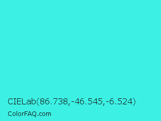 CIELab 86.738,-46.545,-6.524 Color is a normal cyan color and the nearest color is Turquoise #40e0d0. Hex code #3cf1e4 and RGB value is rgb(60,241,228). In RGB color space, this color is composed of 24% red, 95% green, 89% blue, In CMYK color space, this color is composed of 75% cyan, 0% magenta, 5% yellow , 5% black , In HSL color space, this color has a hue angle of 176° , 87% saturation and 59% lightness.