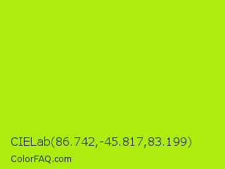 CIELab 86.742,-45.817,83.199 Color is a normal lime color and the nearest color is Inch Worm #b0e313. Hex code #aded0d and RGB value is rgb(173,237,13). In RGB color space, this color is composed of 68% red, 93% green, 5% blue, In CMYK color space, this color is composed of 27% cyan, 0% magenta, 95% yellow , 7% black , In HSL color space, this color has a hue angle of 77° , 90% saturation and 49% lightness.