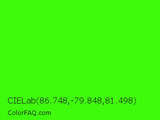CIELab 86.748,-79.848,81.498 Color is a normal green color and the nearest color is Neon Green #39ff14. Hex code #40fa0e and RGB value is rgb(64,250,14). In RGB color space, this color is composed of 25% red, 98% green, 5% blue, In CMYK color space, this color is composed of 74% cyan, 0% magenta, 94% yellow , 2% black , In HSL color space, this color has a hue angle of 107° , 96% saturation and 52% lightness.