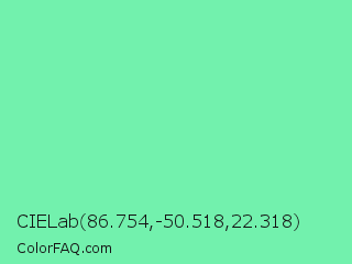 CIELab 86.754,-50.518,22.318 Color is a light green color and the nearest color is Medium Aquamarine #66ddaa. Hex code #72f1ad and RGB value is rgb(114,241,173). In RGB color space, this color is composed of 45% red, 95% green, 68% blue, In CMYK color space, this color is composed of 53% cyan, 0% magenta, 28% yellow , 5% black , In HSL color space, this color has a hue angle of 148° , 82% saturation and 70% lightness.