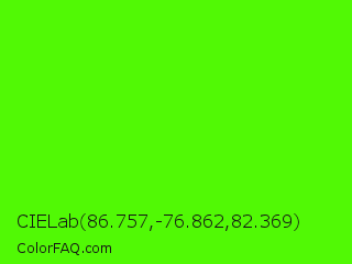 CIELab 86.757,-76.862,82.369 Color is a normal green color and the nearest color is Chlorophyll Green #4aff00. Hex code #51f905 and RGB value is rgb(81,249,5). In RGB color space, this color is composed of 32% red, 98% green, 2% blue, In CMYK color space, this color is composed of 67% cyan, 0% magenta, 98% yellow , 2% black , In HSL color space, this color has a hue angle of 101° , 96% saturation and 50% lightness.