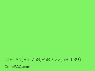 CIELab 86.758,-58.922,58.139 Color is a light green color and the nearest color is Screamin Green #66ff66. Hex code #7ff363 and RGB value is rgb(127,243,99). In RGB color space, this color is composed of 50% red, 95% green, 39% blue, In CMYK color space, this color is composed of 48% cyan, 0% magenta, 59% yellow , 5% black , In HSL color space, this color has a hue angle of 108° , 86% saturation and 67% lightness.