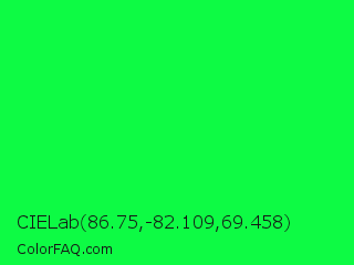 CIELab 86.75,-82.109,69.458 Color is a normal green color and the nearest color is Malachite #0bda51. Hex code #0dfb44 and RGB value is rgb(13,251,68). In RGB color space, this color is composed of 5% red, 98% green, 27% blue, In CMYK color space, this color is composed of 95% cyan, 0% magenta, 73% yellow , 2% black , In HSL color space, this color has a hue angle of 134° , 97% saturation and 52% lightness.