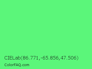 CIELab 86.771,-65.856,47.506 Color is a light green color and the nearest color is Very Light Malachite Green #64e986. Hex code #5bf67a and RGB value is rgb(91,246,122). In RGB color space, this color is composed of 36% red, 96% green, 48% blue, In CMYK color space, this color is composed of 63% cyan, 0% magenta, 50% yellow , 4% black , In HSL color space, this color has a hue angle of 132° , 90% saturation and 66% lightness.