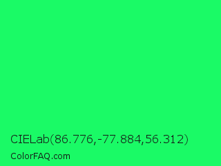 CIELab 86.776,-77.884,56.312 Color is a normal green color and the nearest color is Spring Green #00ff7f. Hex code #1afa66 and RGB value is rgb(26,250,102). In RGB color space, this color is composed of 10% red, 98% green, 40% blue, In CMYK color space, this color is composed of 90% cyan, 0% magenta, 59% yellow , 2% black , In HSL color space, this color has a hue angle of 140° , 96% saturation and 54% lightness.