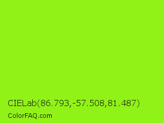 CIELab 86.793,-57.508,81.487 Color is a normal green color and the nearest color is Spring Frost #87ff2a. Hex code #91f217 and RGB value is rgb(145,242,23). In RGB color space, this color is composed of 57% red, 95% green, 9% blue, In CMYK color space, this color is composed of 40% cyan, 0% magenta, 90% yellow , 5% black , In HSL color space, this color has a hue angle of 87° , 89% saturation and 52% lightness.