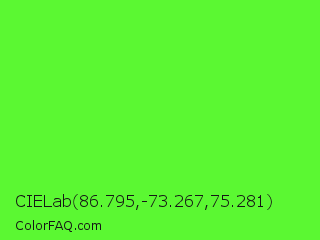 CIELab 86.795,-73.267,75.281 Color is a normal green color and the nearest color is Spring Frost #87ff2a. Hex code #5bf832 and RGB value is rgb(91,248,50). In RGB color space, this color is composed of 36% red, 97% green, 20% blue, In CMYK color space, this color is composed of 63% cyan, 0% magenta, 80% yellow , 3% black , In HSL color space, this color has a hue angle of 108° , 93% saturation and 58% lightness.