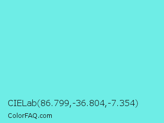 CIELab 86.799,-36.804,-7.354 Color is a light cyan color and the nearest color is Turquoise Blue #6cdae7. Hex code #6eede6 and RGB value is rgb(110,237,230). In RGB color space, this color is composed of 43% red, 93% green, 90% blue, In CMYK color space, this color is composed of 54% cyan, 0% magenta, 3% yellow , 7% black , In HSL color space, this color has a hue angle of 177° , 78% saturation and 68% lightness.