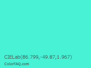 CIELab 86.799,-49.87,1.967 Color is a light cyan color and the nearest color is Turquoise #40e0d0. Hex code #47f2d4 and RGB value is rgb(71,242,212). In RGB color space, this color is composed of 28% red, 95% green, 83% blue, In CMYK color space, this color is composed of 71% cyan, 0% magenta, 12% yellow , 5% black , In HSL color space, this color has a hue angle of 169° , 87% saturation and 61% lightness.