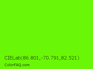 CIELab 86.801,-70.791,82.521 Color is a normal green color and the nearest color is Bright Green #66ff00. Hex code #6af707 and RGB value is rgb(106,247,7). In RGB color space, this color is composed of 42% red, 97% green, 3% blue, In CMYK color space, this color is composed of 57% cyan, 0% magenta, 97% yellow , 3% black , In HSL color space, this color has a hue angle of 95° , 94% saturation and 50% lightness.