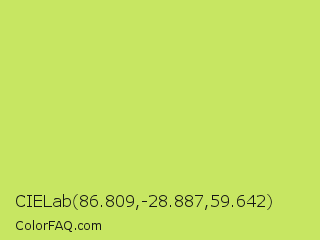 CIELab 86.809,-28.887,59.642 Color is a light lime color and the nearest color is June Bud #bdda57. Hex code #c7e662 and RGB value is rgb(199,230,98). In RGB color space, this color is composed of 78% red, 90% green, 38% blue, In CMYK color space, this color is composed of 13% cyan, 0% magenta, 57% yellow , 10% black , In HSL color space, this color has a hue angle of 74° , 73% saturation and 64% lightness.