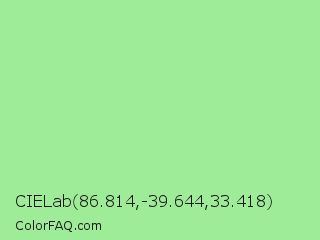 CIELab 86.814,-39.644,33.418 Color is a light green color and the nearest color is Granny Smith Apple Crayola #9de093. Hex code #9fec98 and RGB value is rgb(159,236,152). In RGB color space, this color is composed of 62% red, 93% green, 60% blue, In CMYK color space, this color is composed of 33% cyan, 0% magenta, 36% yellow , 7% black , In HSL color space, this color has a hue angle of 115° , 69% saturation and 76% lightness.