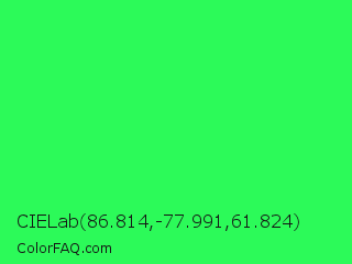 CIELab 86.814,-77.991,61.824 Color is a normal green color and the nearest color is Malachite #0bda51. Hex code #2cfa59 and RGB value is rgb(44,250,89). In RGB color space, this color is composed of 17% red, 98% green, 35% blue, In CMYK color space, this color is composed of 82% cyan, 0% magenta, 64% yellow , 2% black , In HSL color space, this color has a hue angle of 133° , 95% saturation and 58% lightness.