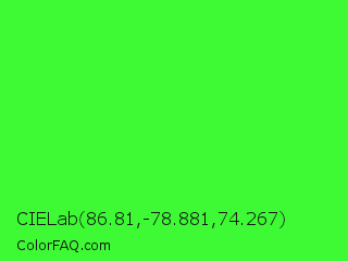 CIELab 86.81,-78.881,74.267 Color is a normal green color and the nearest color is Neon Green #39ff14. Hex code #3dfa35 and RGB value is rgb(61,250,53). In RGB color space, this color is composed of 24% red, 98% green, 21% blue, In CMYK color space, this color is composed of 76% cyan, 0% magenta, 79% yellow , 2% black , In HSL color space, this color has a hue angle of 118° , 95% saturation and 59% lightness.