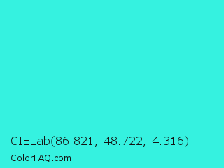 CIELab 86.821,-48.722,-4.316 Color is a normal cyan color and the nearest color is Turquoise #40e0d0. Hex code #35f2e0 and RGB value is rgb(53,242,224). In RGB color space, this color is composed of 21% red, 95% green, 88% blue, In CMYK color space, this color is composed of 78% cyan, 0% magenta, 7% yellow , 5% black , In HSL color space, this color has a hue angle of 174° , 88% saturation and 58% lightness.