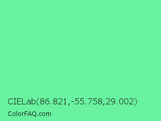 CIELab 86.821,-55.758,29.002 Color is a light green color and the nearest color is Medium Aquamarine #66ddaa. Hex code #69f3a0 and RGB value is rgb(105,243,160). In RGB color space, this color is composed of 41% red, 95% green, 63% blue, In CMYK color space, this color is composed of 57% cyan, 0% magenta, 34% yellow , 5% black , In HSL color space, this color has a hue angle of 144° , 85% saturation and 68% lightness.