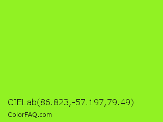 CIELab 86.823,-57.197,79.49 Color is a normal green color and the nearest color is Spring Frost #87ff2a. Hex code #91f223 and RGB value is rgb(145,242,35). In RGB color space, this color is composed of 57% red, 95% green, 14% blue, In CMYK color space, this color is composed of 40% cyan, 0% magenta, 86% yellow , 5% black , In HSL color space, this color has a hue angle of 88° , 89% saturation and 54% lightness.